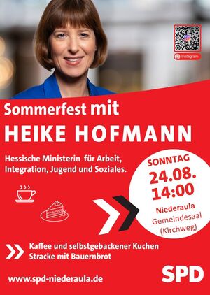 Die SPD Niederaula lädt herzlich zum diesjährigen Sommerfest ein. Dieses findet am Sonntag, den 24. August 2025 ab 14:00 Uhr im evangelischen Gemeinde­zentrum im Kirchweg in Niederaula statt.